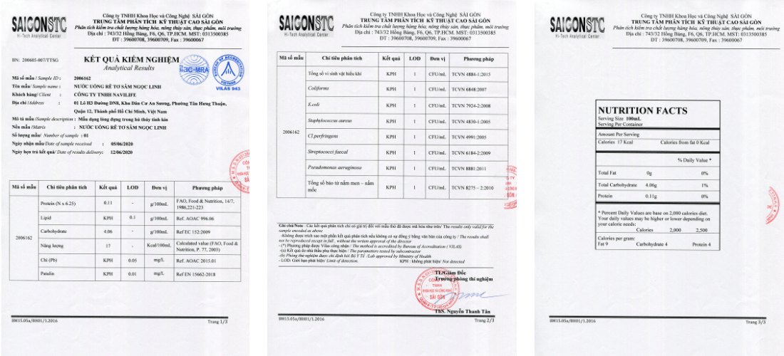 KẾT QUẢ KIỂM NGHIỆM VỀ NƯỚC UỐNG RỄ TƠ SÂM NGỌC LINH