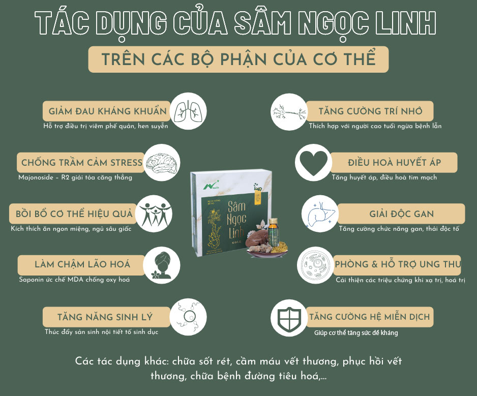 Các thành phần có trong Sâm Ngọc Linh có thể giải độc gan, tăng cường chức năng thận, giảm tác hại của rượu bia, thuốc lá gây ra từ đó nâng cao chức năng của các cơ quan này. Khi sử dụng sản phẩm, người sử dụng sẽ ngăn ngừa được sự tích tụ các độc tố trong cơ thể nhờ hoạt động chức năng gan tốt, chống lại sự tích tụ của Cholesterol trong hai bộ phận này để cơ thể luôn được thoải mái nhất.